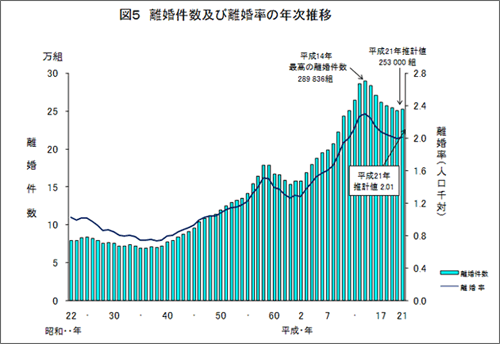 とはいえ、2010年については推計になりますが、25万1千組もの夫婦が離婚をしている状況です。増加の始まった1970年以前と比較し、約3倍の件数であることは間違いありません。